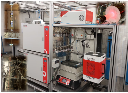 Für die Untersuchung von Umsetzungs-, Adsorptions- und Reaktionsprozessen steht dem Lehrstuhl für Carbon Sources and Conversion eine vielseitige Hochtemperaturanlage zur Verfügung. Der zweistufige Ofenaufbau ermöglicht die Durchführung verfahrenstechnischer Prozesse unter kontrollierten Temperatur- und Gasphasenbedingungen. Durch die Implementierung eines Hochtemperaturmoduls sind Untersuchungstemperaturen von bis zu 1500 °C realisierbar. Die integrierten Massenflussregler gewährleisten eine präzise und variable Gaszufuhr (unter anderem H2, CO2, CO u. a.). Mittels eines Massenspektrometers kann die Gasphase innerhalb der Anlage hochauflösend analysiert und selbst Spurenkomponenten zuverlässig detektiert werden.
