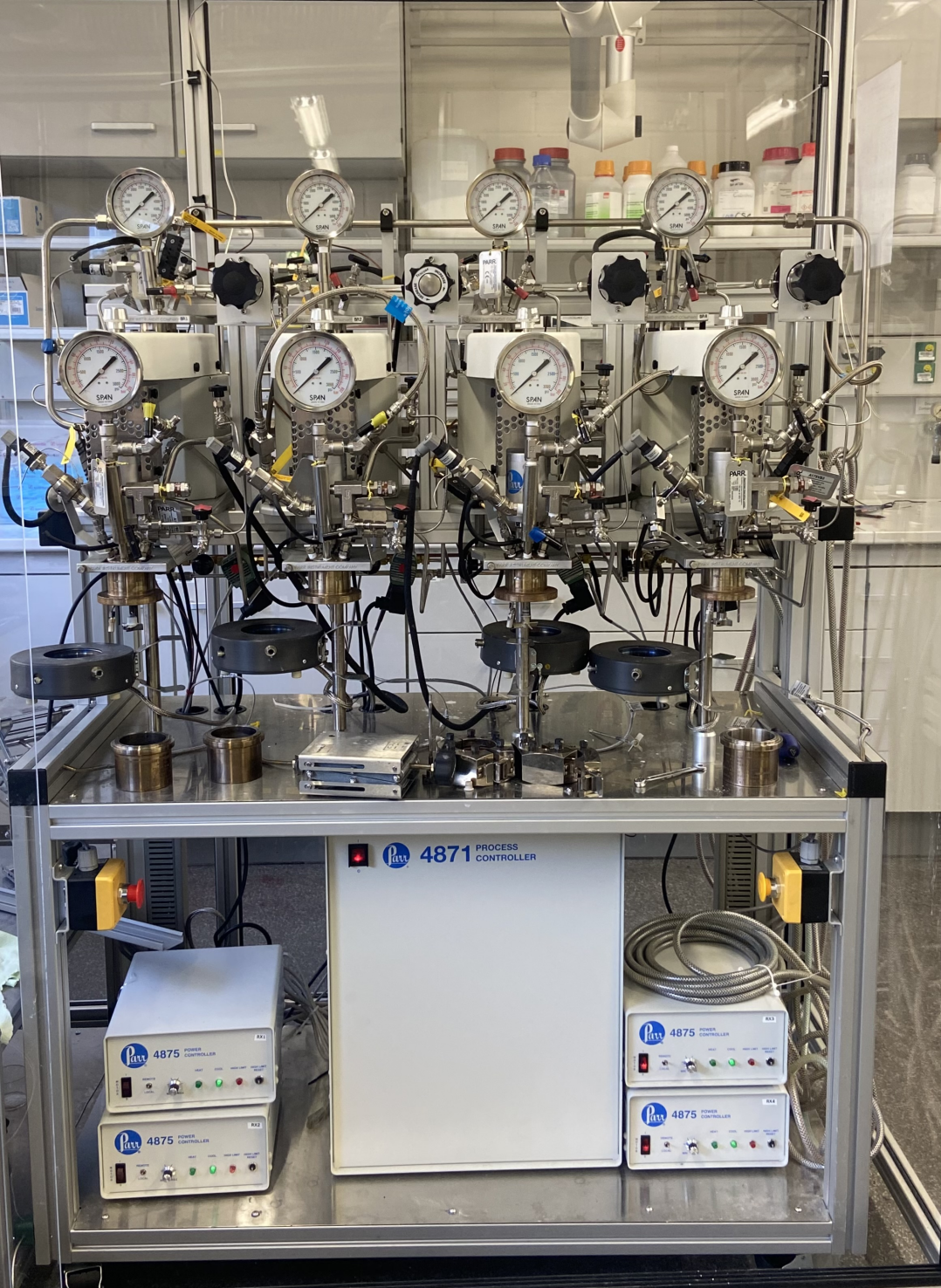 Zur Untersuchung thermochemischer Reaktionen in flüssigen und gasförmigen Phasen unter definierten Temperatur- und Druckbedingungen steht am Lehrstuhl für Carbon Sources and Conversion ein paralleles Mehrfachreaktorsystem aus hochfestem Edelstahl zur Verfügung. Die Anlage besteht aus vier unabhängig voneinander betriebenen Reaktorbehältern (je 160 ml), die jeweils mit einer 175-ml-Edelstahlbürette zur Gaszufuhr und -steuerung verbunden und für hohe thermische und mechanische Belastungen ausgelegt sind. Jeder Reaktor ist mit einem speziellen hochpräzisen analogen Druckwandler ausgestattet, der eine kontinuierliche, individuelle Überwachung der Betriebsbedingungen ermöglicht. Flüssigkeits- und Gaszufuhrleitungen mit integrierten Ventilen und robusten Anschlüssen ermöglichen eine sichere und stabile Steuerung der Reaktantenzufuhr zu jedem Reaktor. Mit Rühreinheiten in jedem Behälter wird eine effiziente und homogene Durchmischung der Reaktionsmedien erreicht. Im unteren Teil der Anlage sind die elektronischen Steuereinheiten untergebracht, darunter ein zentraler Prozessregler und spezielle Module für die thermische und betriebliche Steuerung jedes Reaktors. Diese Komponenten ermöglichen eine präzise Regelung von Temperatur, Druck, Rührgeschwindigkeit und Reaktionszeit in automatisierten Verfahren mit hoher Reproduzierbarkeit.